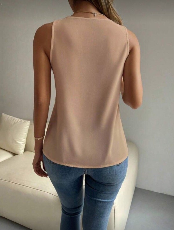 Blusa sin mangas, liviana y con caída delicada. El diseño se destaca por su encaje floral aplicado en forma de V, que recorre el frente y enmarca el escote con sutileza, aportando textura y un aire romántico. Su silueta recta acompaña el cuerpo sin ceñir, logrando un equilibrio ideal entre comodidad y sofisticación.