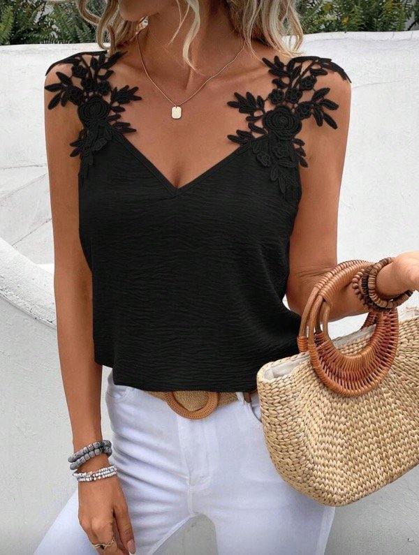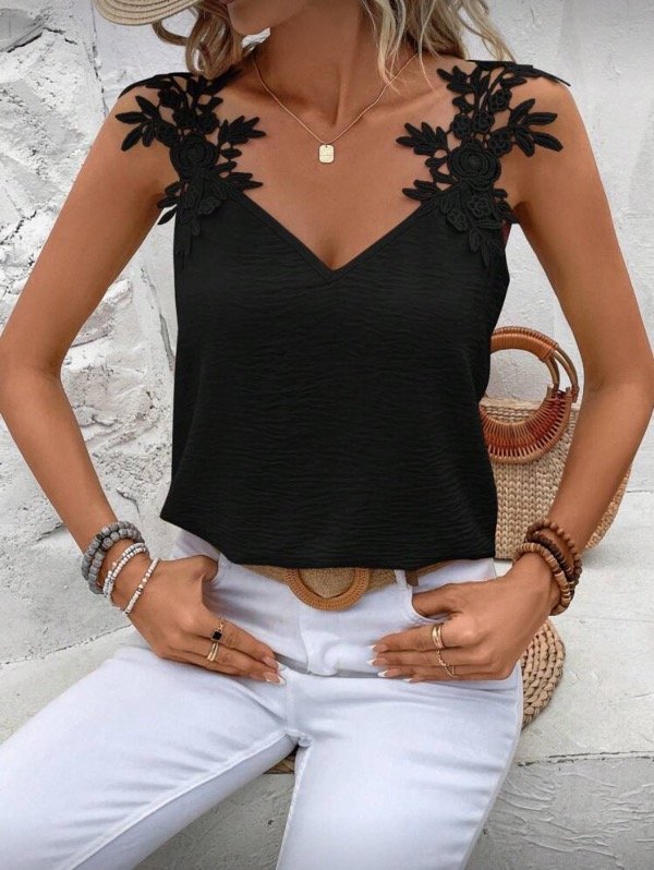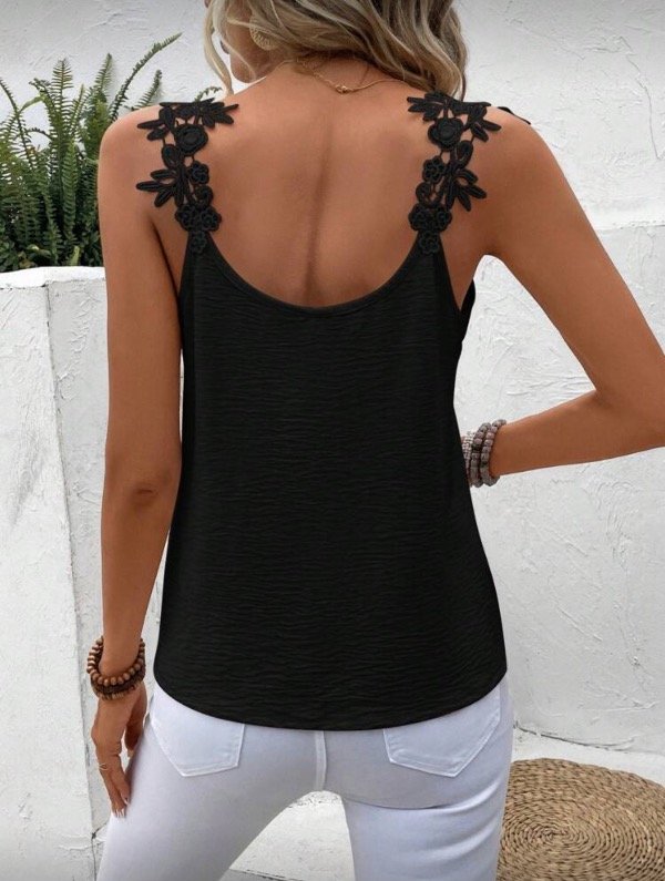 Musculosa confeccionada en crepé con caída suave. Posee apliques florales en los breteles, un detalle romántico que realza cualquier look.